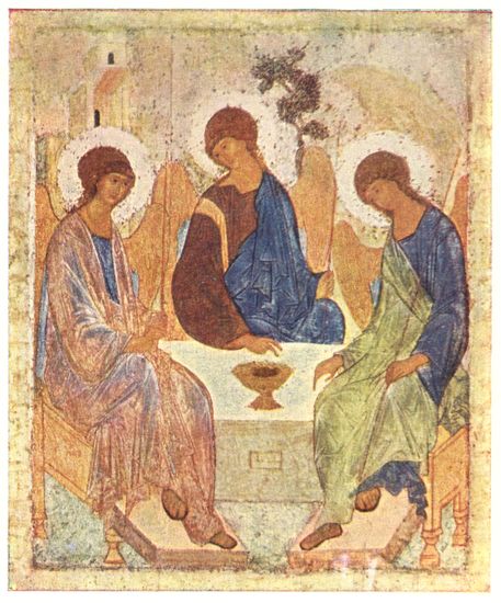 Именно этот библейский рассказ лег в основу иконографии Троицы. Она изображается в виде трех ангелов со странническими посохами в руках. Ангелы торжественно восседают за столом, уставленным яствами. Вдали виднеются палаты Авраама и легендарный Мамврийский дуб. Благочестивые Авраам и Сарра подносят крылатым странникам угощение.