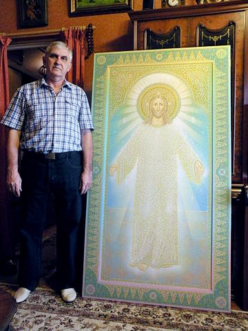 Я спрашиваю как он стал иконописцем? Оказалось,что зимой 1994 года художник Юрий Кузнецов, работающий в бюро по эстетике одного из оружейных заводов города Коврова, попал в автокатастрофу. Чудом остался цел. Чудом, в тридцатиградусный мороз добрался до города. Заболел от сильнейшего потрясения и переохлаждения. Когда пришло выздоровление, рука сама потянулась к кисти… и как будто сам собой стал возникать узор из множества цветовых точек, сложившийся в сияющий дивным светом лик Спасителя. Чудо? Да. Но ему предшествовала многолетняя работа, годы напряженного духовного поиска: изучение иконописи, святоотеческой литературы, развитие в себе сильной и чистой веры. Так возникло уникальное «кузнецовское письмо»: соединение строгого следования канону с совершенно новой иконописной техникой. Его иконы, как будто выложены из излучающих свет драгоценных камней и жемчуга, хотя на самом деле это традиционная темпера. Как достигается такой эффект? «Мне нужен цвет,говорит он, который не существует в природе. Его нельзя передать обычными живописными средствами: не существует желто-фиолетового или сине-красного цвета. А в этой технике, если нанести рядом три и более (до 2000) точек, казалось бы несовместимых оттенков, в результате получается «несуществующий», неземной тон. Впрочем, краски кажутся несовместимыми только в процессе письма, а когда заканчиваешь икону, видишь вдруг полную гармонию. Цвета, которые, казалось бы, не могут соседствовать друг с другом, прекрасно сочетаются… Глаз смешивает краски сам. «По вере вашей да будет вам» - чем сильнее и чище вера, тем лучше получается. Икону надо творить в радости духа, гармонии и чистоте помыслов. Рука сама ставит точки: три, четыре, десять, двадцать… цвет невероятный, чистый и какой-то нежный. Специально так не нарисуешь. А как это получается, сам не знаю».